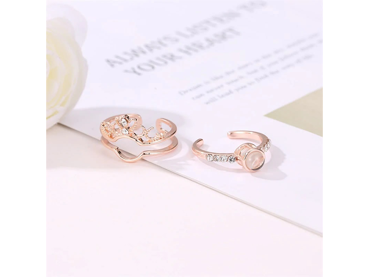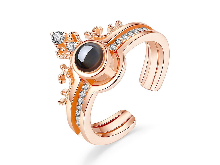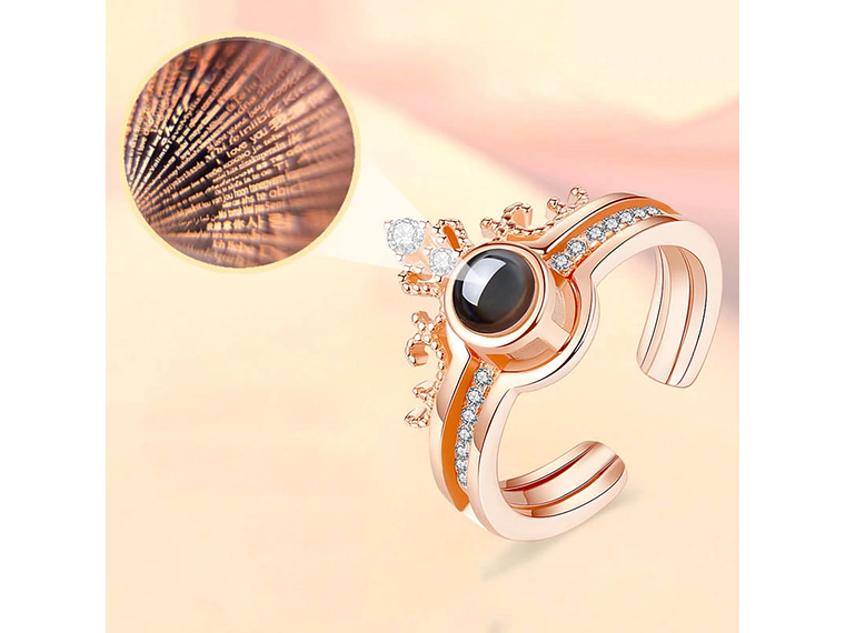 Excelente anillo con forma de corona que dice te amo en 100 idiomas diferentes, fabricado en aleación de cobre decorado con hermosos circones de calidad AAA. Puede verse con la luz del celular sobre una superficie blanca o sacándole una foto a la parte convexa del collar de excelente calidad y finas terminaciones, incluimos de regalo elegante cajita de terciopelo totalmente gratis con su compra.