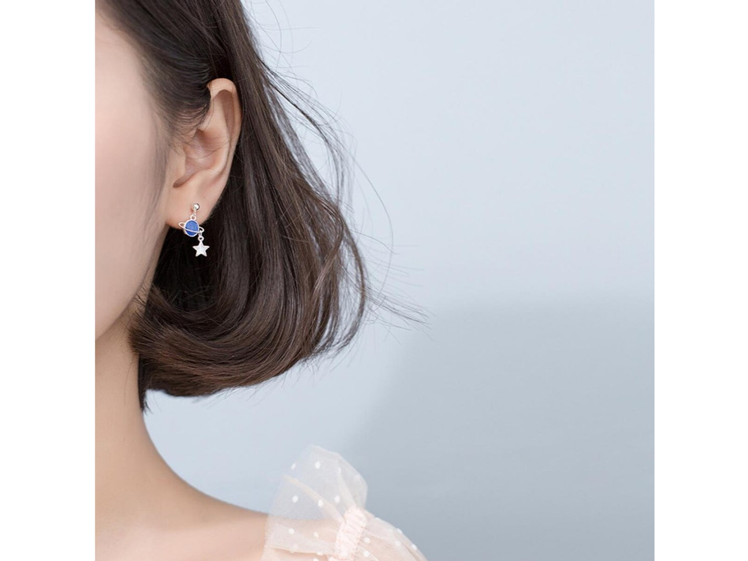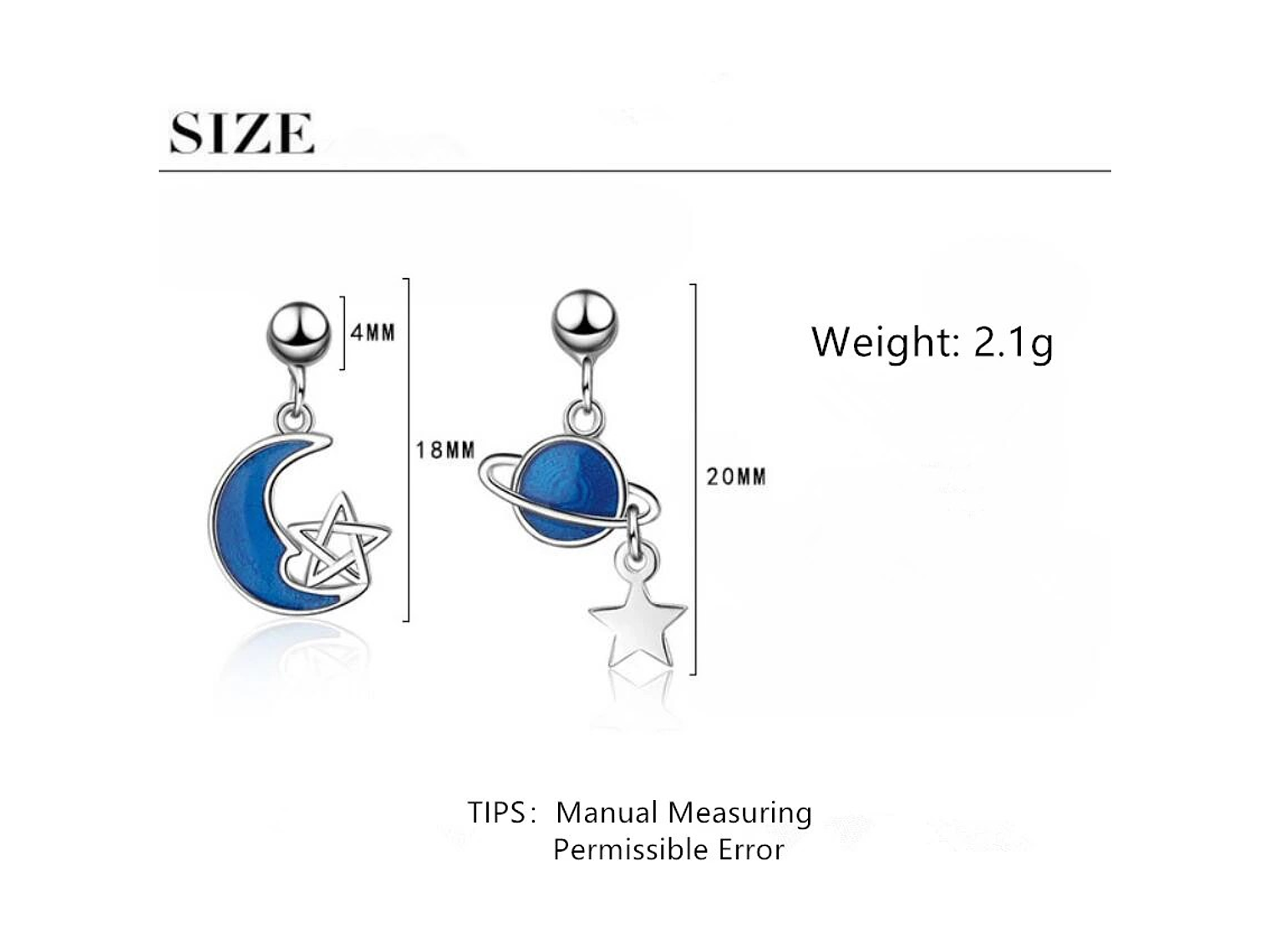 Excelente y elegante par de aros estilo pasador con forma de planeta y luna azul, con novedoso diseño asimétricos o desigual todo esmaltado y bañado en plata de excelente calidad y finas terminaciones, medida de los aros: 18x10mm, incluimos de regalo elegante cajita de cartón para joya totalmente gratis con su compra.