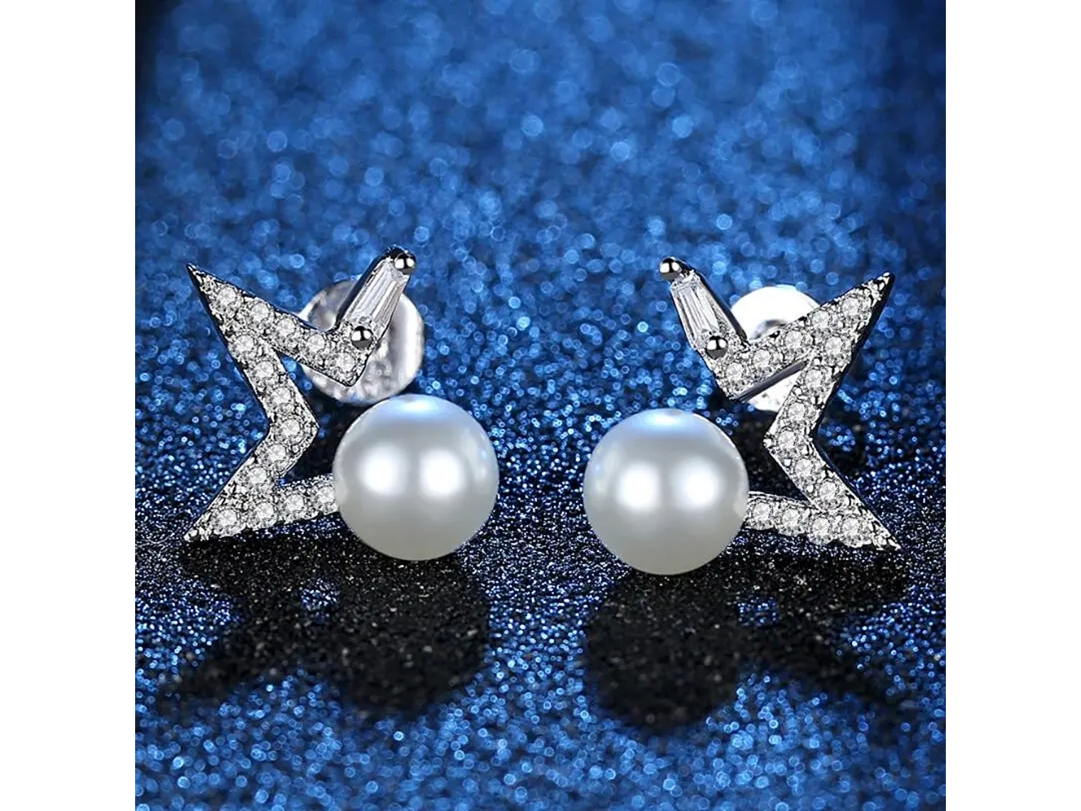 Excelente y elegante par de aros estilo pasador con forma de Estrella y Perla Blanca Plateado, todo bañado en plata de excelente calidad y finas terminaciones, medida de los aros: 12x12mm, incluimos de regalo elegante cajita de cartón para joya totalmente gratis con su compra.