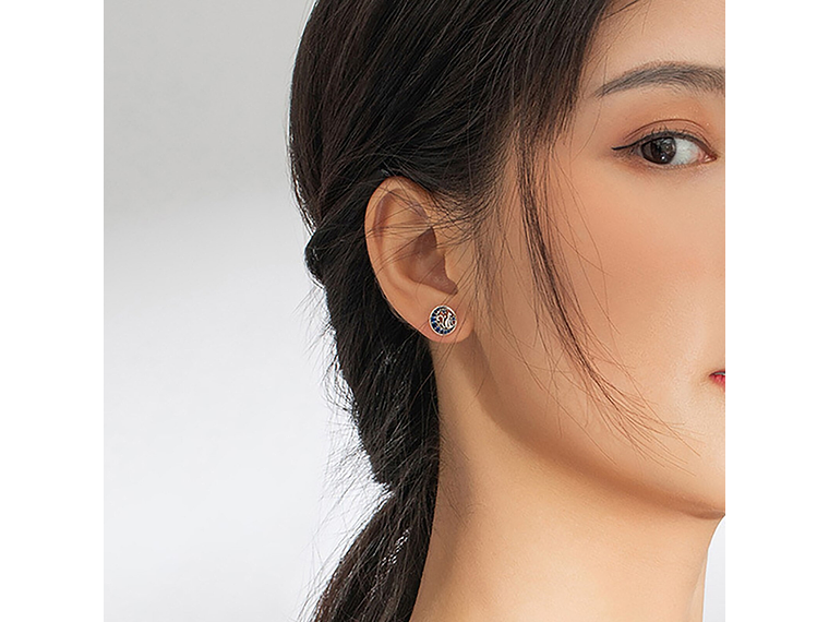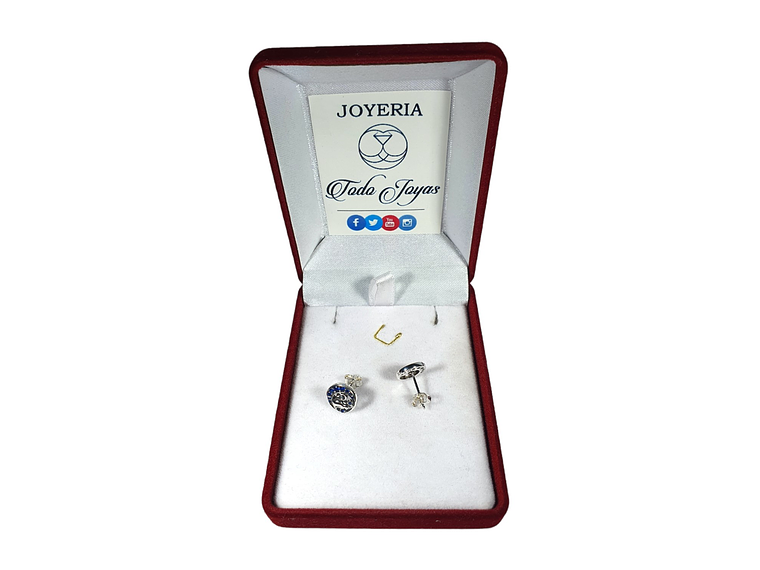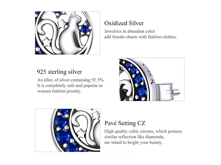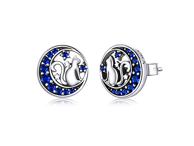 Excelente y elegante par de aros estilo pasador con forma de Gato en Luna Azul, todo en plata 925 de excelente calidad y finas terminaciones, decorado con hermosos circones, medida de los aros: 9x9mm, incluimos de regalo elegante cajita de terciopelo totalmente gratis con su compra.