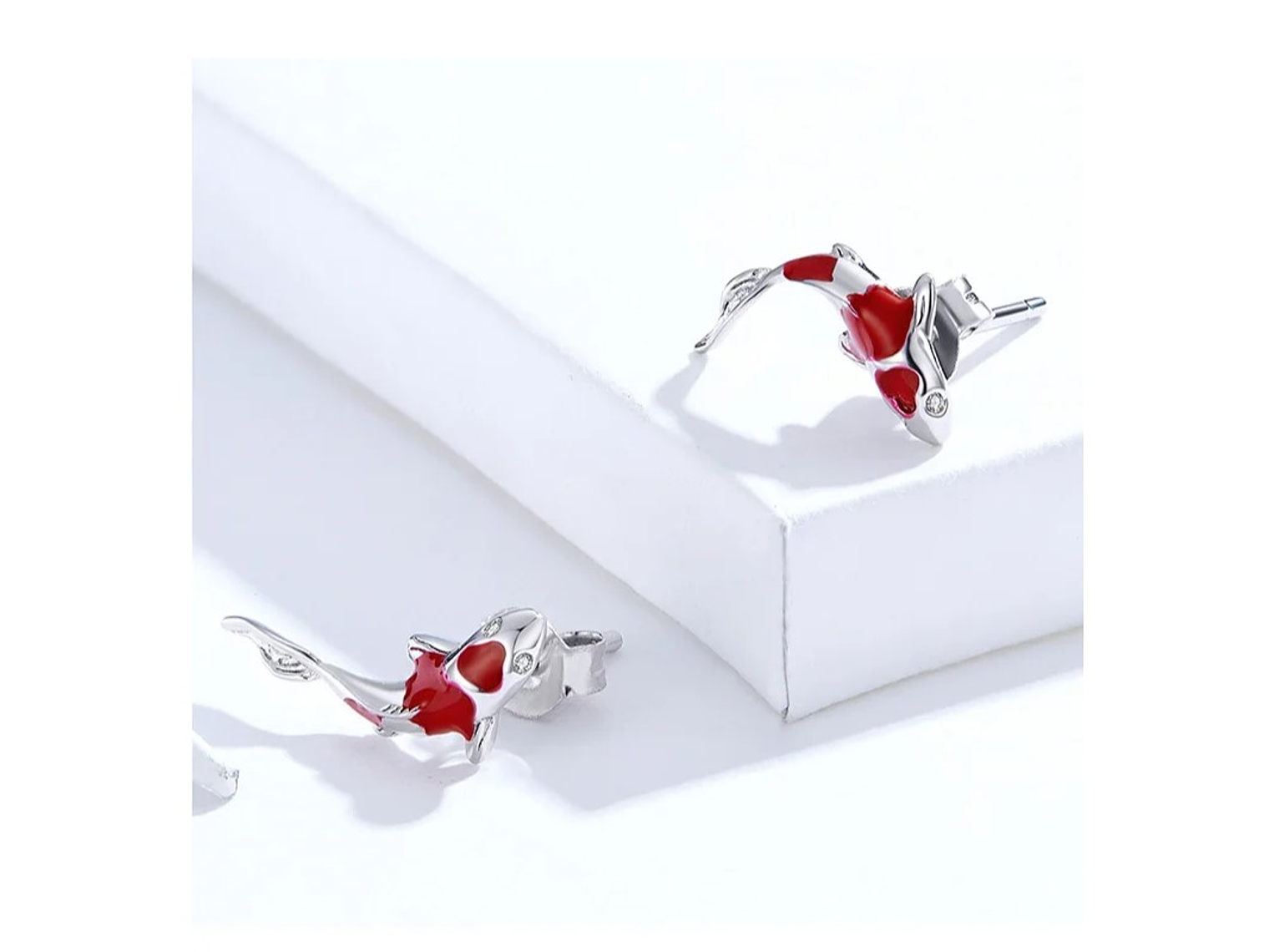 Excelente y elegante par de aros estilo pasador con forma de Pez de la Suerte Koi Rojo, exclusivo y novedoso modelo, todo en plata 925 de excelente calidad y finas terminaciones, medida de los aros: 16x6mm, incluimos elegante cajita para joya de cartón totalmente gratis con su compra.