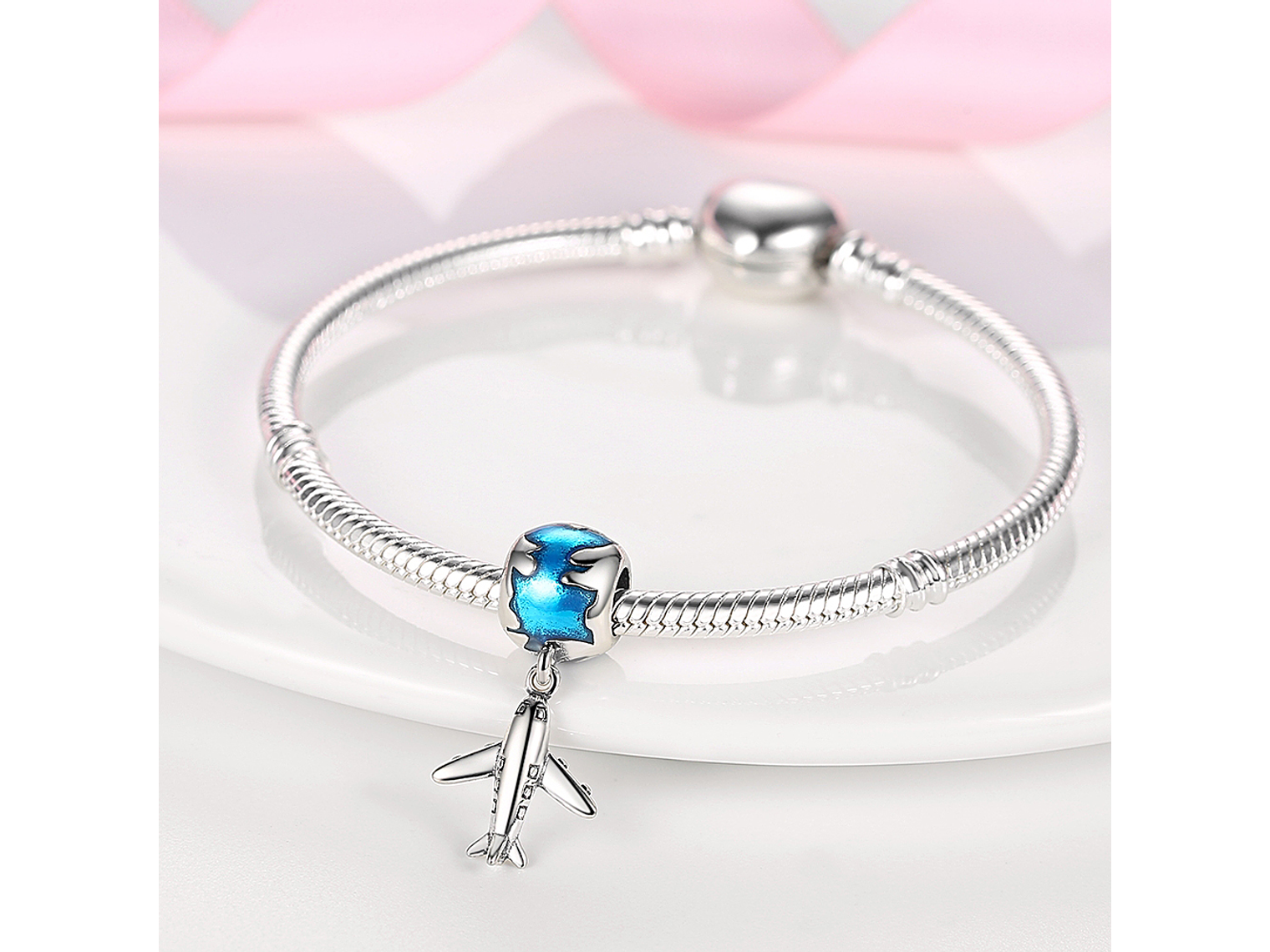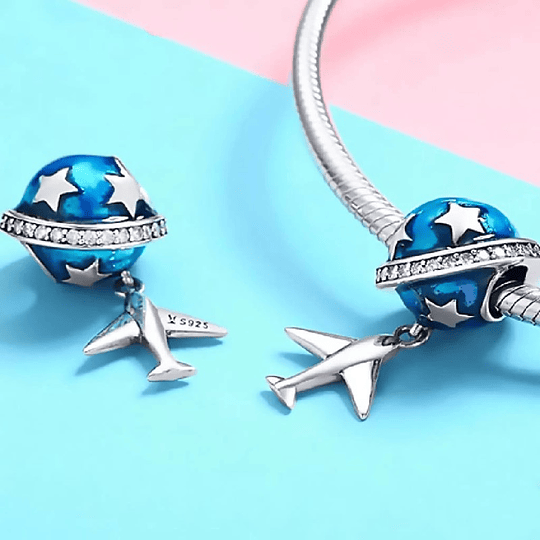 Hermoso y elegante Charm con forma de Avión y Planeta Azul, fabricado en plata 925, excelente calidad y terminaciones, incluimos de regalo elegante cajita de cartón totalmente gratis con su compra.