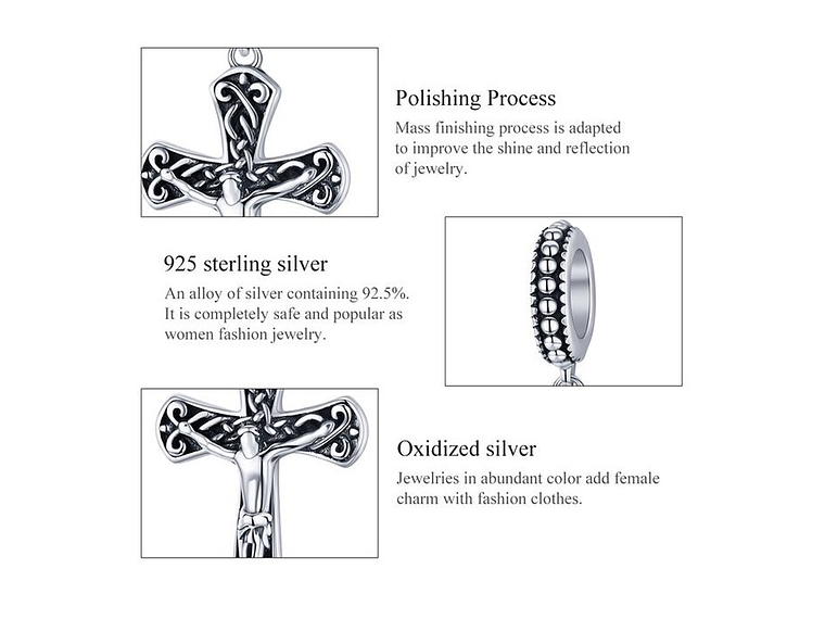 Hermoso y elegante charm con forma de Crucifijo Cristo fabricada en plata 925 de primera ley y cristales, 100% compatible con pulseras de charm. Incluimos de regalo elegante cajita de cartón totalmente gratis con su compra.
