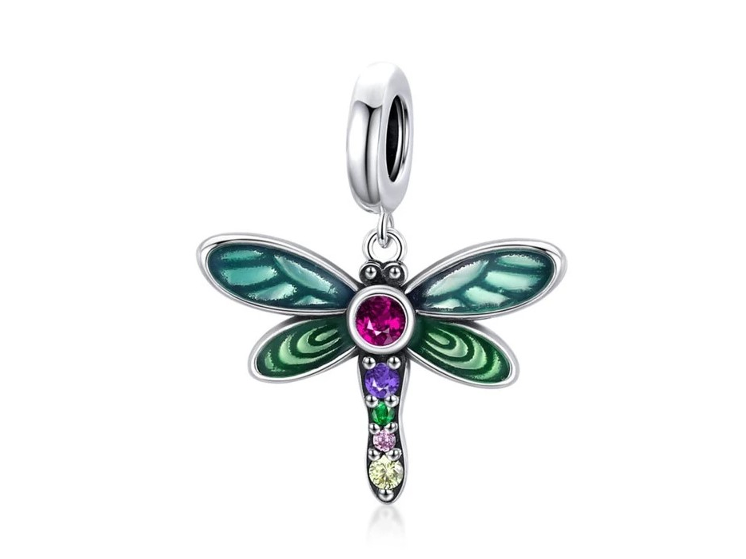Hermoso y elegante charm con forma de libélula multicolor fabricada en plata 925 de primera ley y cristales, 100% compatible con pulseras de charm. Incluimos de regalo elegante cajita de cartón totalmente gratis con su compra.
