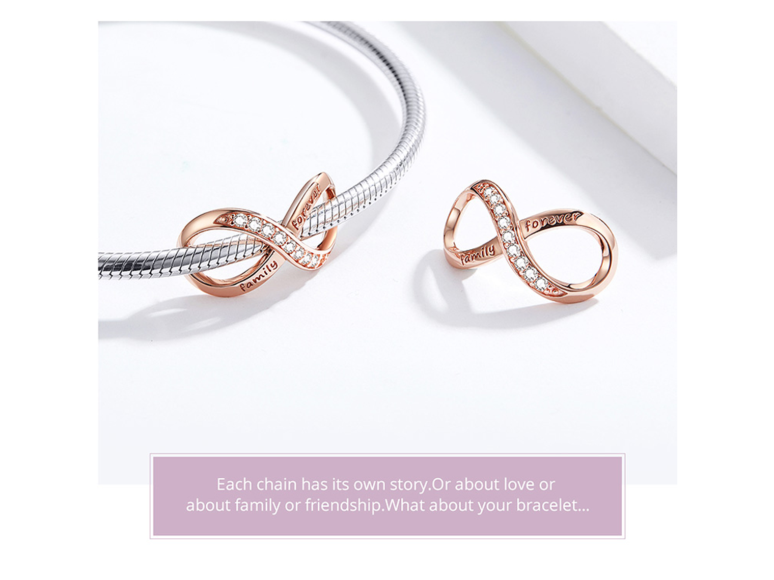 Hermoso y elegante Charm con forma de Infinito Rose Gold, fabricado en plata 925, excelente calidad y terminaciones, incluimos de regalo elegante cajita de cartón totalmente gratis con su compra.