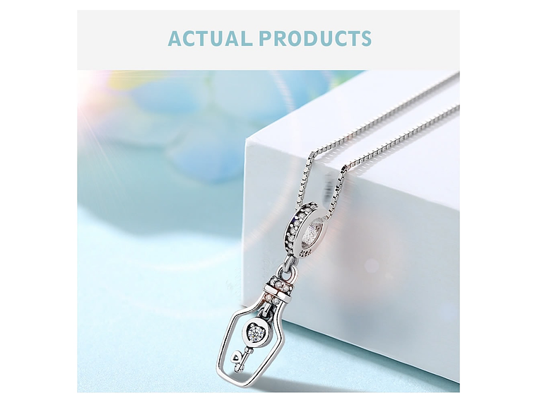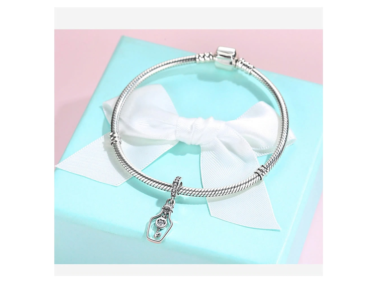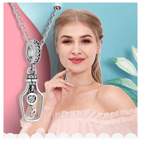 Hermoso Charm con forma de botella con llave interior, con hermosos circones de calidad AAA, fabricado en plata ley 925, excelente calidad y finas terminaciones, incluimos de regalo elegante cajita de terciopelo totalmente gratis con su compra.