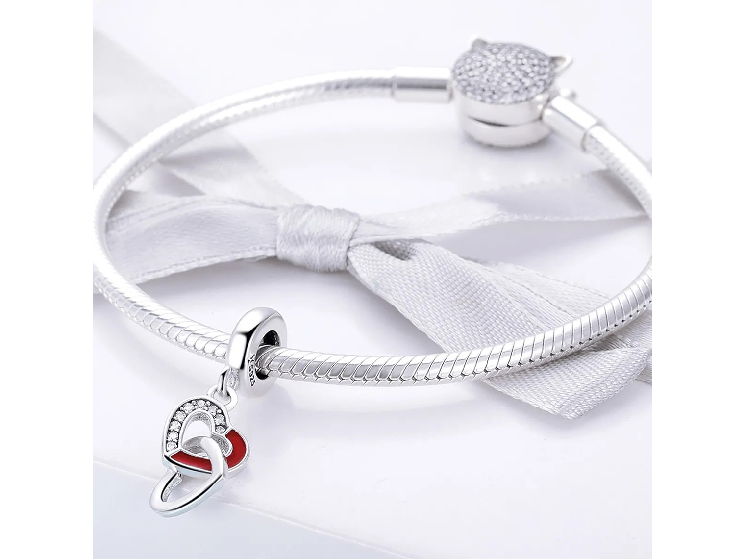 Hermoso, elegante y exclusivo Charm con forma de Corazón Entrelazados, fabricado en plata 925 excelente calidad y finas terminaciones, decorado con hermosos circones de alta calidad, incluimos de regalo elegante cajita de regalo estándar totalmente gratis con su compra.