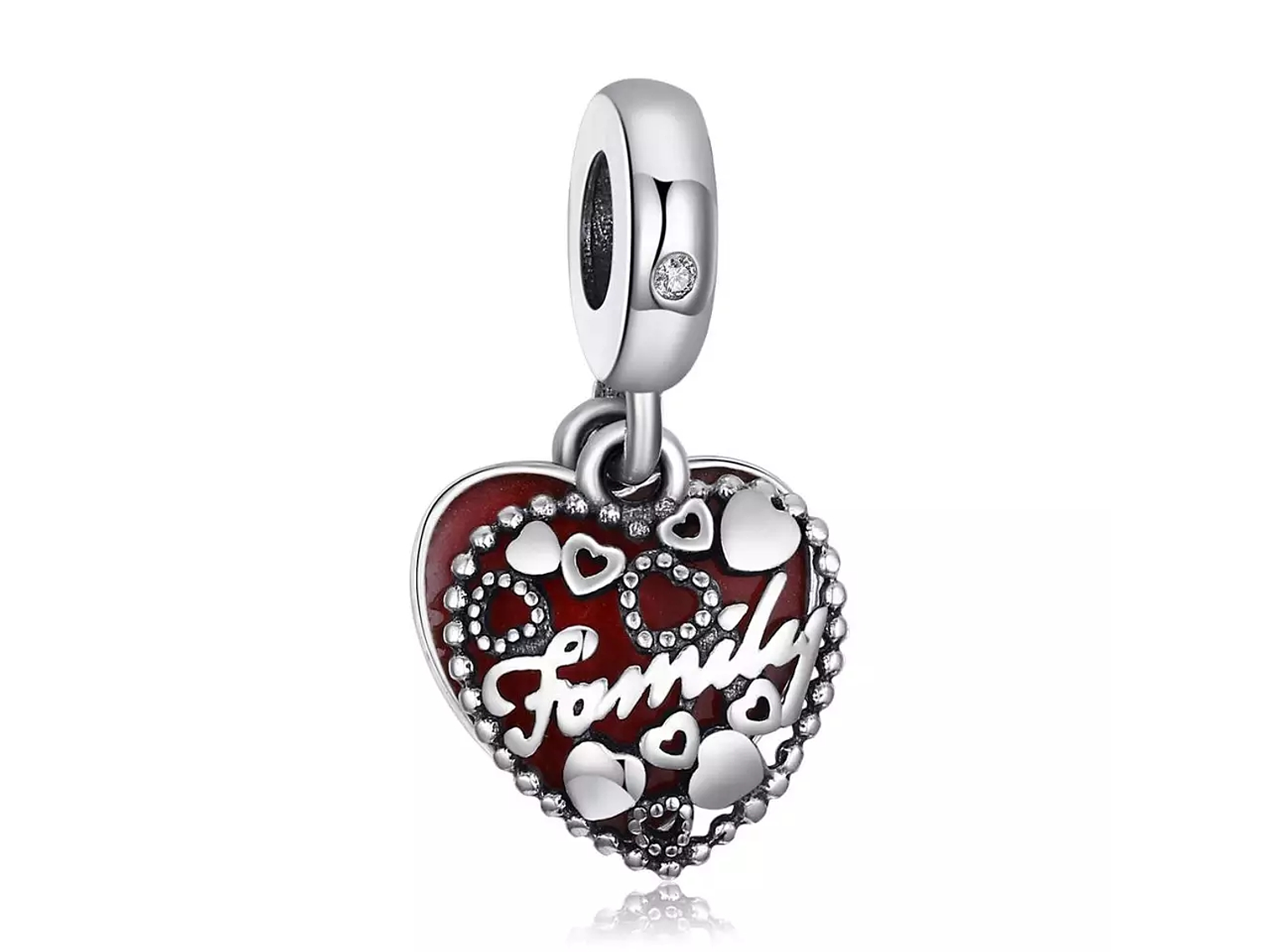 Hermoso y elegante Charm con forma de de doble corazón plateado y rojo con la palabra FAMILY (Familia), fabricado en plata ley 925, excelente calidad y finas terminaciones, decorado con unos hermosos circones brillantes de calidad AAA, incluimos de regalo elegante cajita de regalo totalmente gratis con su compra.