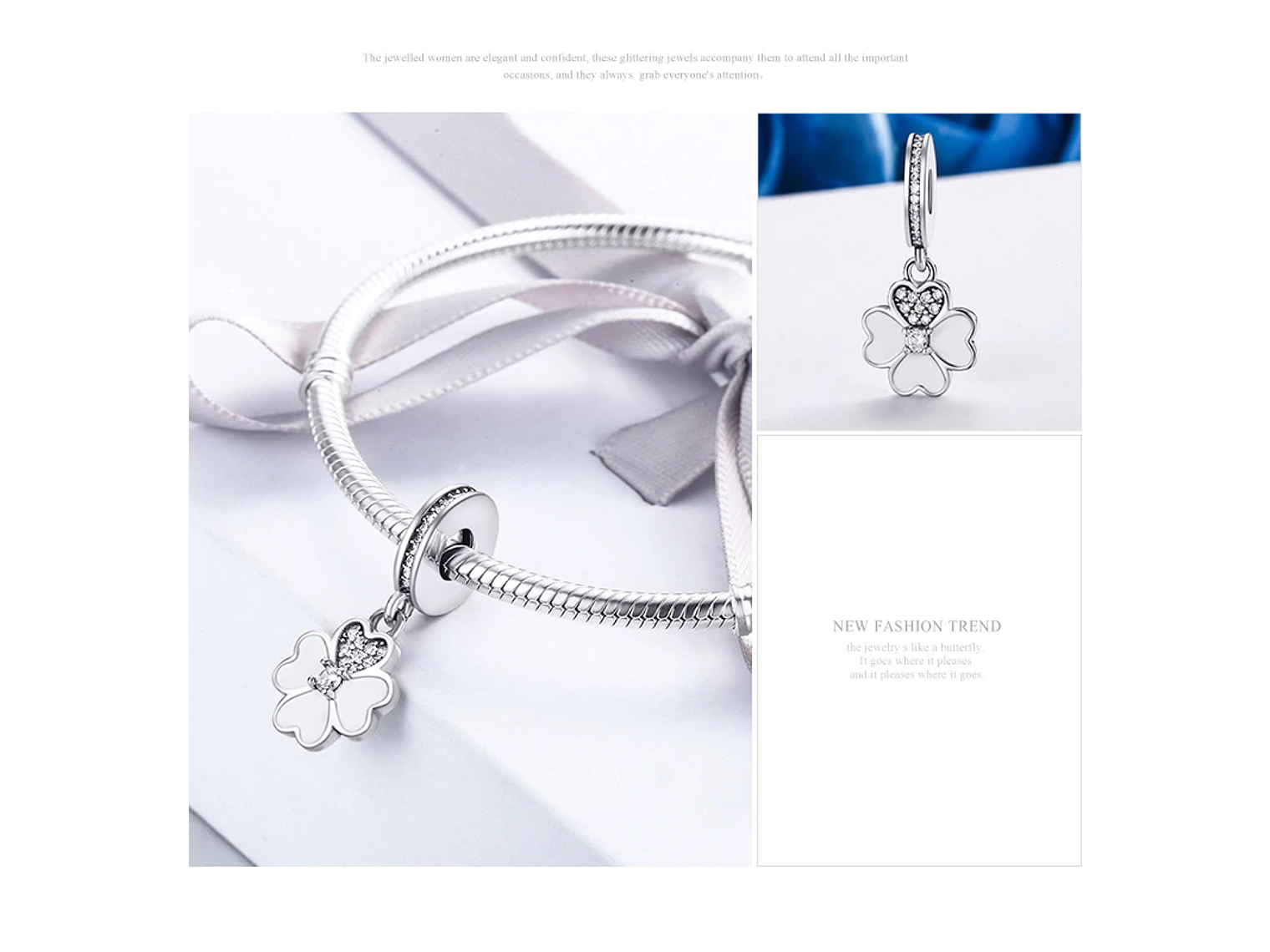 Hermoso, elegante y exclusivo Charm con forma de trébol blanco colgante de la suerte, fabricado en plata ley 925 excelente calidad y finas terminaciones, decorados con circones CZ de excelente calidad y brillo, incluimos de regalo elegante cajita de regalo estándar totalmente gratis con su compra.