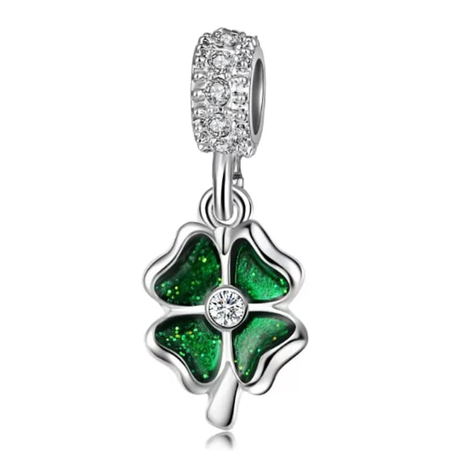 Hermoso Charm con forma de trébol de la suerte de cuatro hojas verdes, fabricado en aleación bañado en plata de excelente calidad y terminaciones, incluimos de regalo elegante cajita de terciopelo totalmente gratis con su compra.