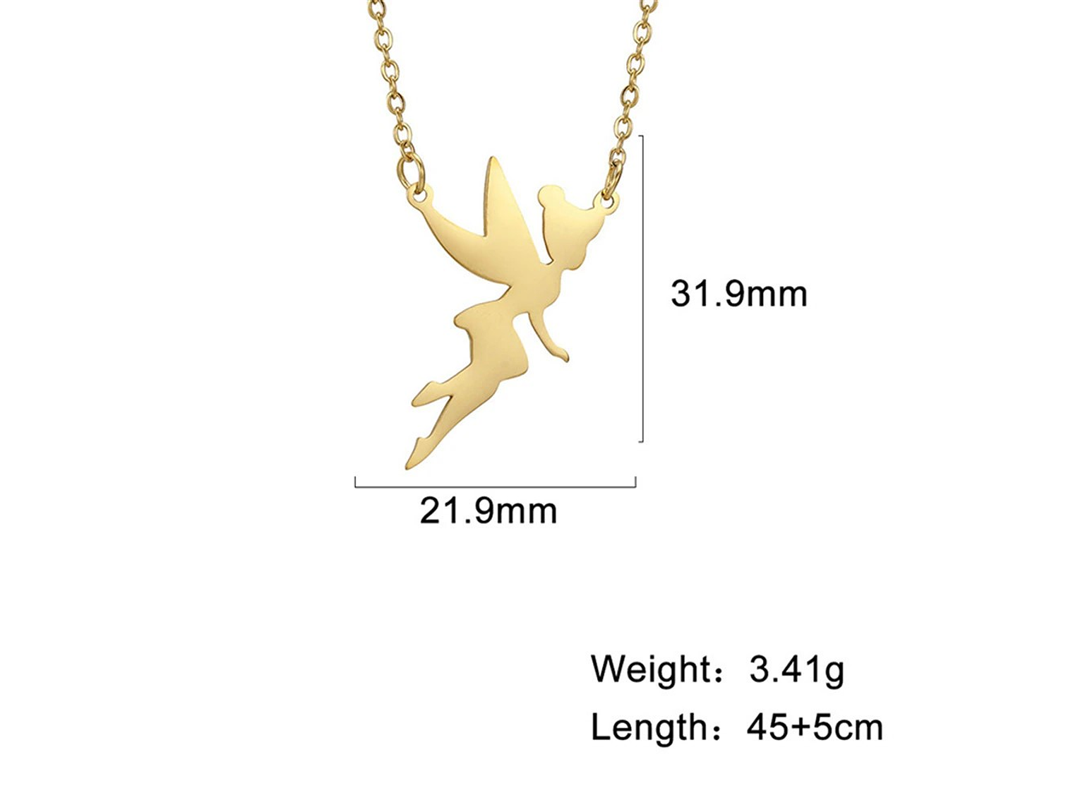 Excelente y elegante colgante con forma de Collar Hada Acero Dorado en acero inoxidable de alta calidad medida del colgante: 30mm x 20mm, Cadena modelo tradicional de 45+5cms unisex en acero, incluimos de regalo elegante cajita de cartón para joyas totalmente gratis con su compra.