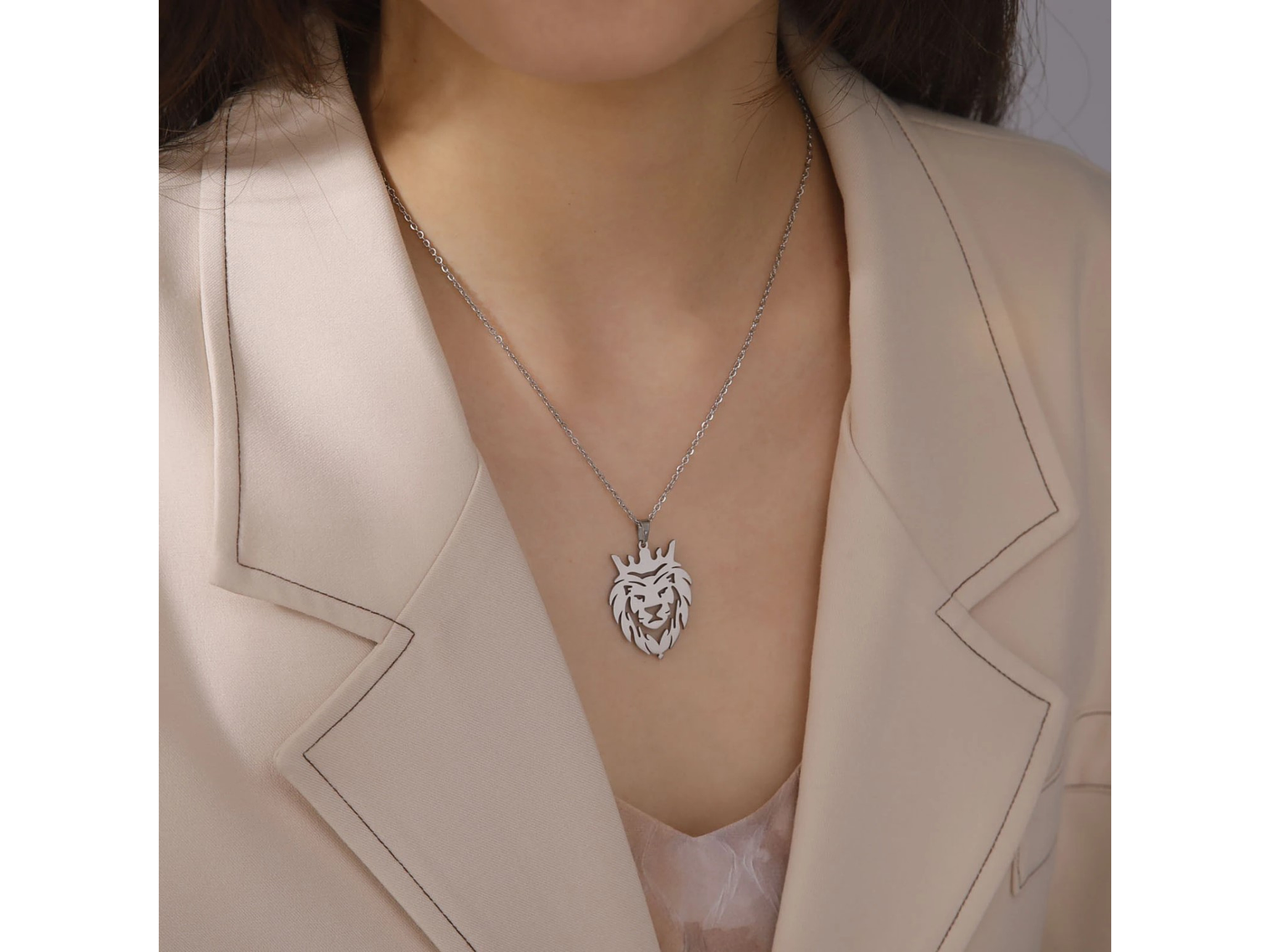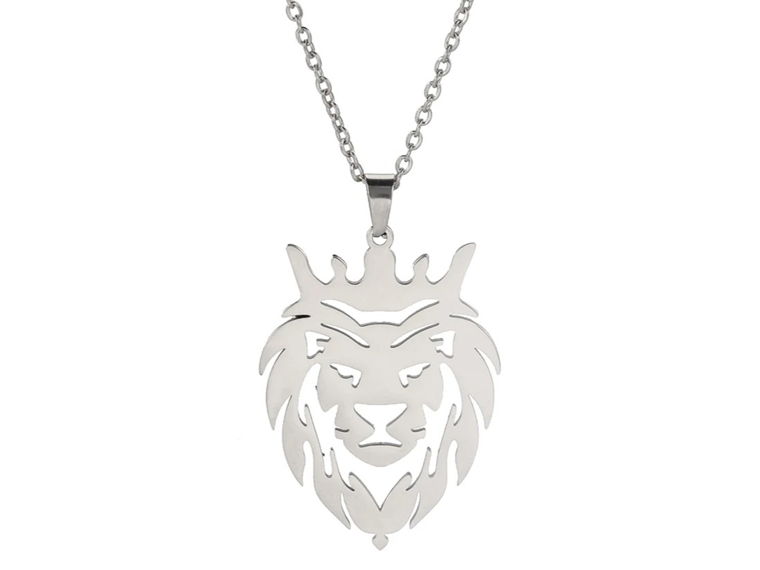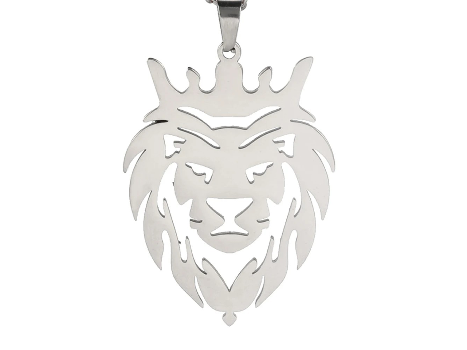 Excelente y exclusivo collar colgante con forma de Cabeza León Corona King Acero en color Plateado de acero inoxidable de alta calidad medida del colgante: 38mm x 24mm, Cadena modelo tradicional de 50cms unisex en acero, incluimos de regalo elegante cajita de cartón para joyas totalmente gratis con su compra.