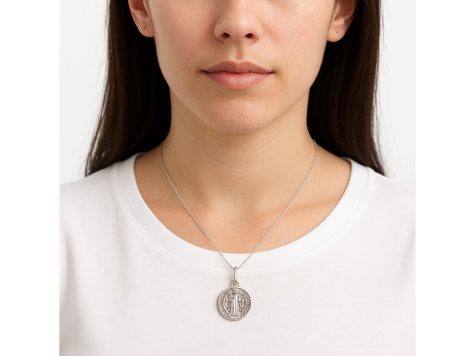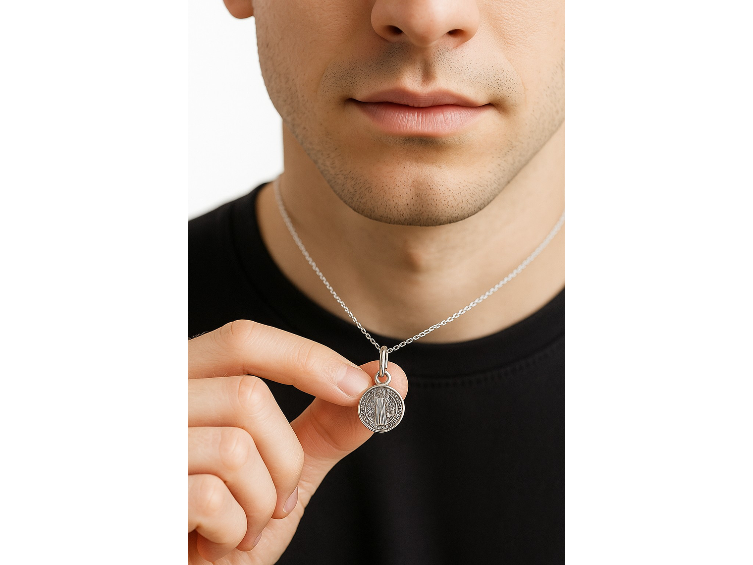 Excelente colgante medalla de San Benito (Saint Benedict) con cruz trasera fabrica en plata ley 925 de excelente calidad y terminaciones, diámetro de la medalla 12mm, Cadena tipo clásica de 50cms unisex en plata ley 925, incluimos elegante cajita de regalo totalmente gratis con su compra.