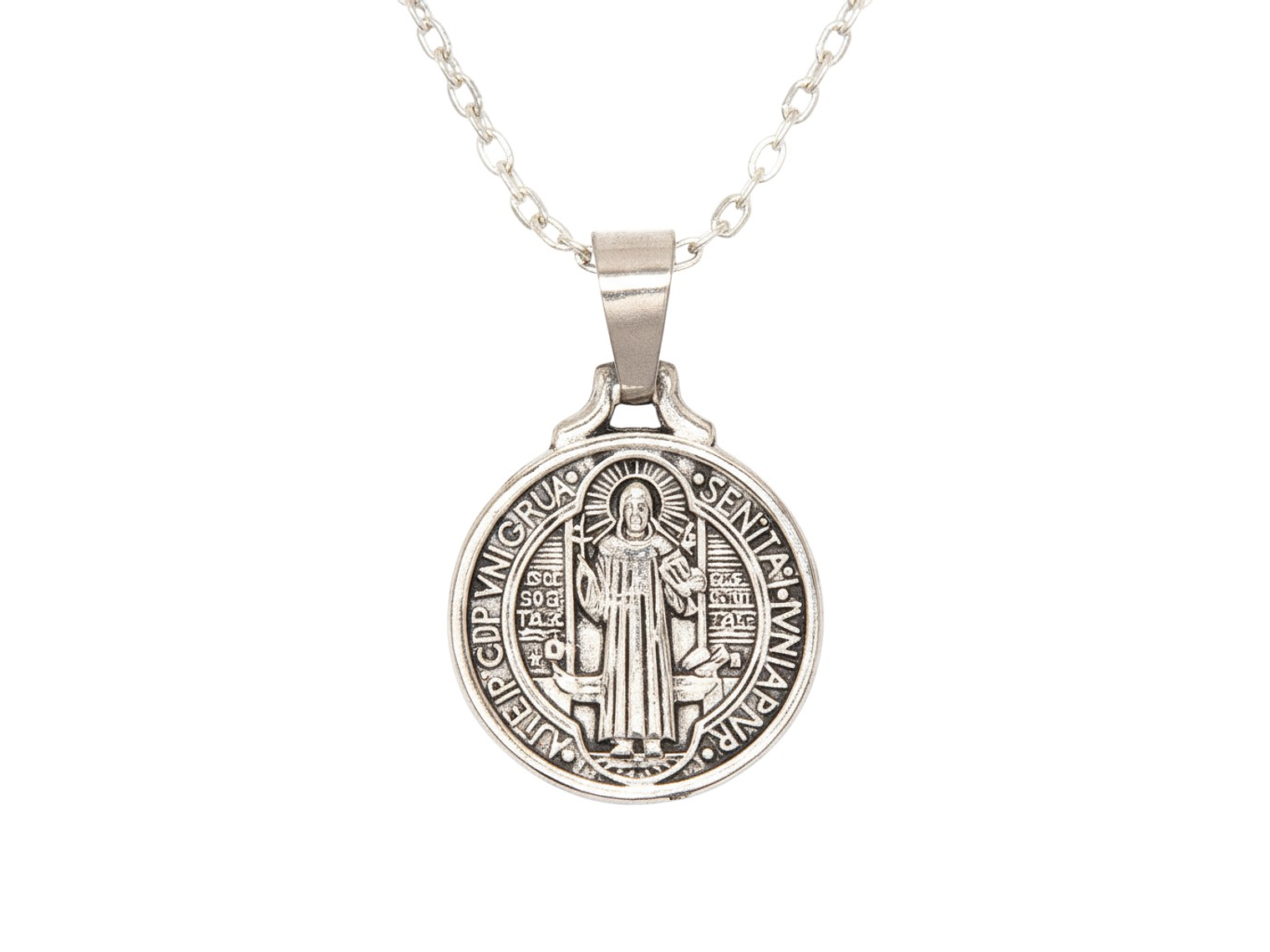 Excelente colgante medalla de San Benito (Saint Benedict) con cruz trasera fabrica en aleación de zinc de excelente calidad y terminaciones, medidas de medalla 26mm x 18mm, Cadena tipo clásica de 45 cms unisex bañada plata 925, incluimos de regalo elegante cajita de terciopelo totalmente gratis con su compra.