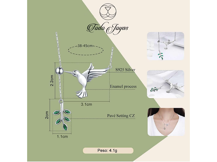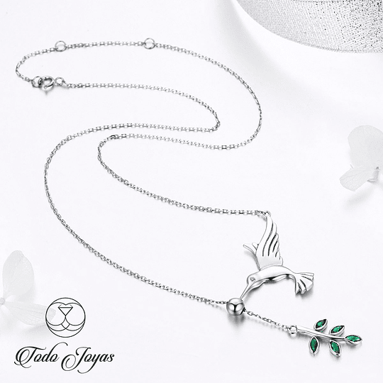 Excelente collar con forma de colibrí o pájaro en plata ley 925 con cadena tipo eslabones de 45cms, forma de hoja con circones color verde, incluimos de regalo elegante cajita de terciopelo totalmente gratis con su compra.