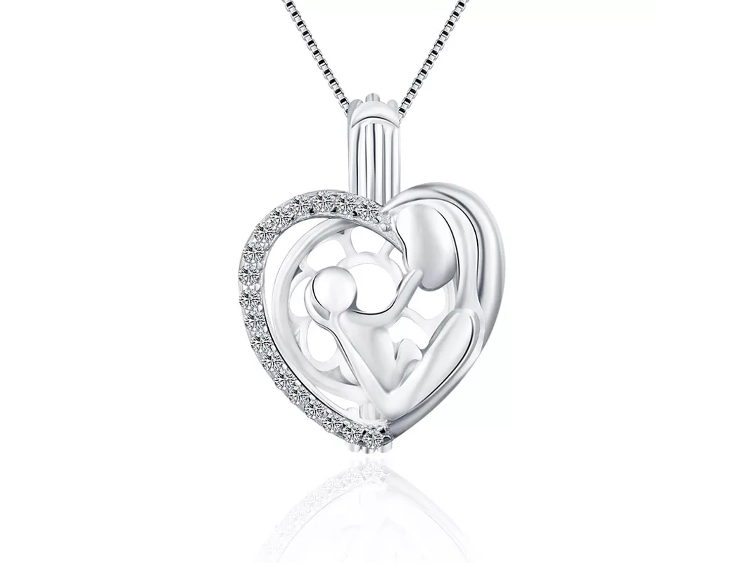 Excelente y elegante collar con diseño de corazón con interior figura de una madre con su hij@, dije incluye al interior una perla cultivada de rio 7 mm el cual se puede abrir tipo bisagras, color plateado, todo en plata 925 terminaciones mejoradas, incluimos de regalo elegante cajita de regalo totalmente gratis con su compra.