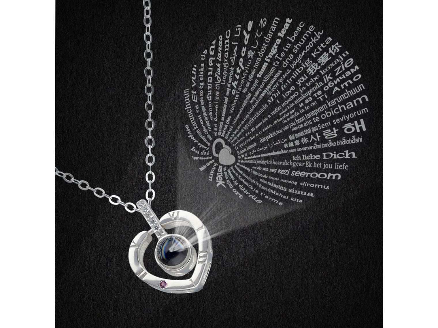 Excelente y elegante collar con diseño de corazón te Amo en 100 idiomas con el cual puede verse con la luz del celular sobre una superficie blanca o sacándole una foto a la parte convexa del collar, todo en plata 925 terminaciones mejoradas, incluimos de regalo elegante cajita de regalo totalmente gratis con su compra.