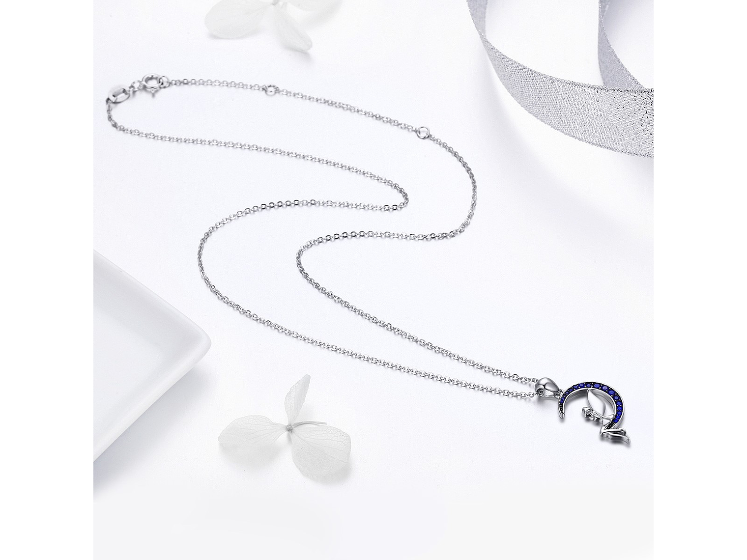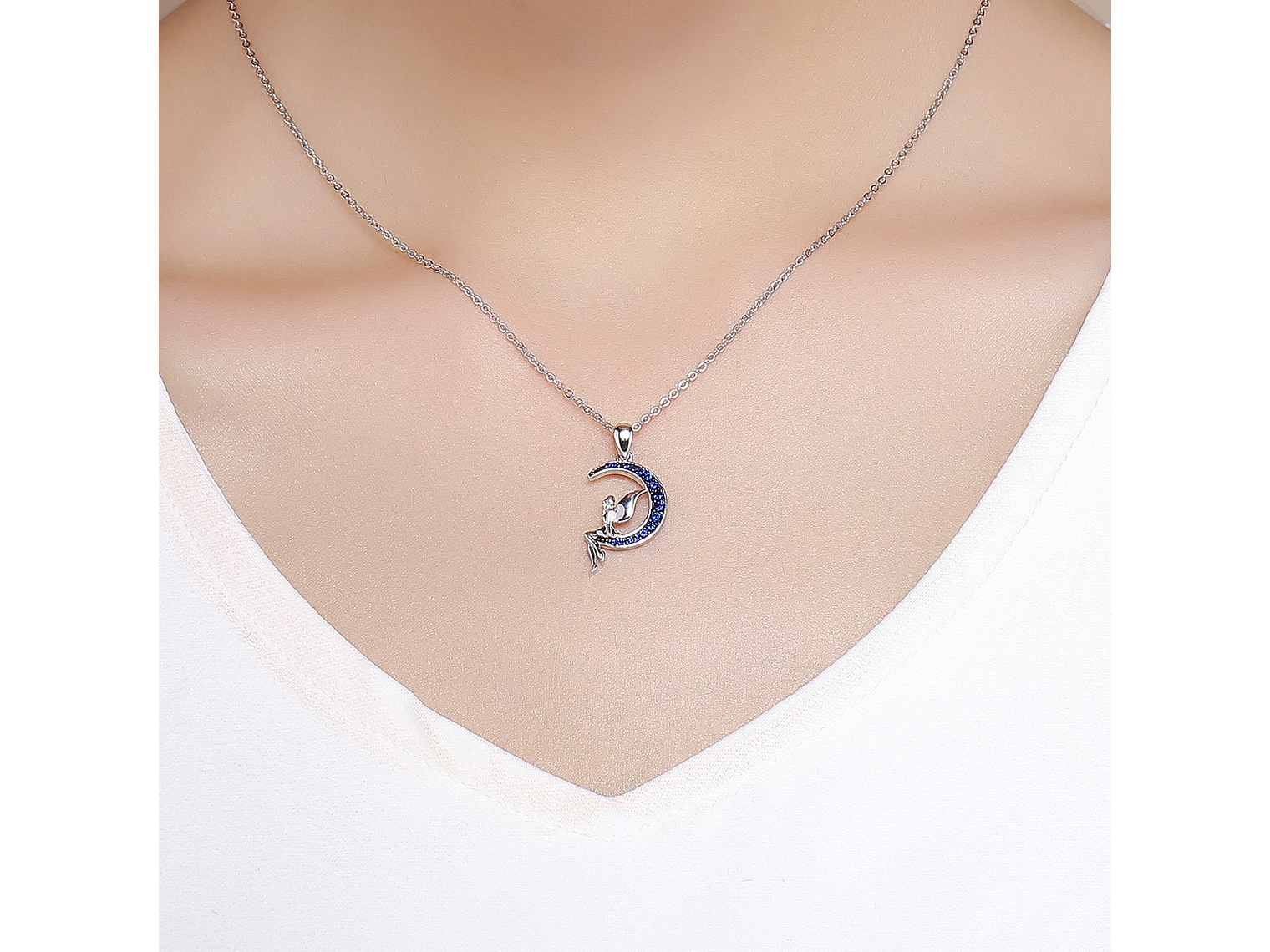 Excelente collar con forma de hada y luna en plata ley 925 con cadena tipo eslabones de 45cms, con hermosos circones de color azul de calidad AAA, incluimos de regalo elegante cajita de terciopelo totalmente gratis con su compra.