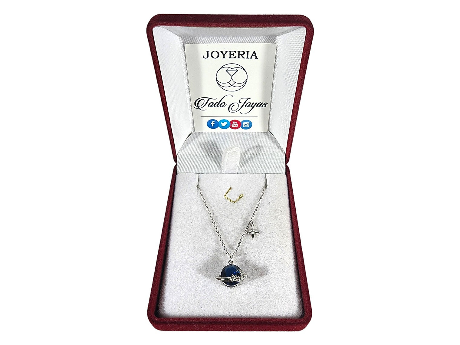 Excelente y elegante collar con diseño de Planeta Azul y Estrellas, decorado con hermoso cristal azul y circones, todo en plata 925 terminaciones mejoradas, incluimos de regalo elegante cajita de regalo totalmente gratis con su compra.