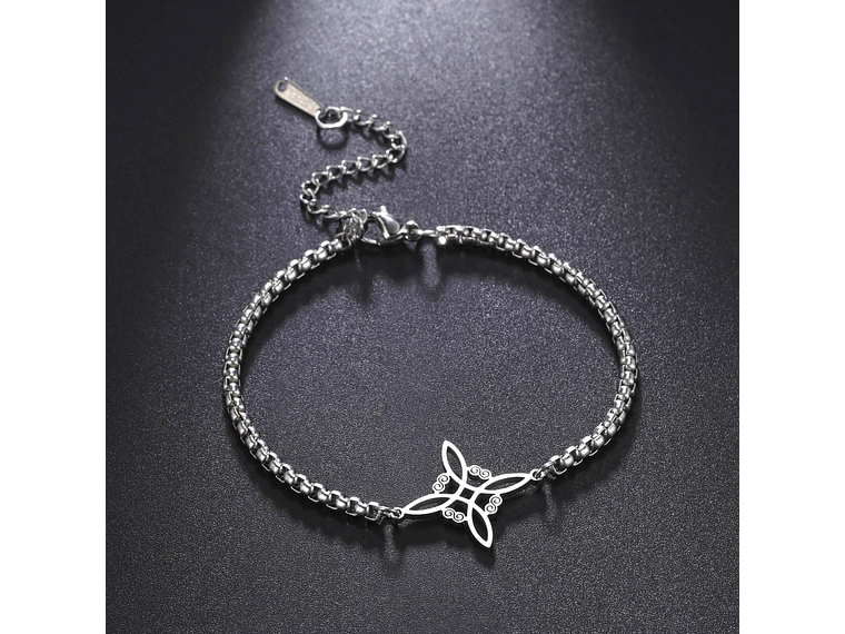 Excelente y elegante pulsera con forma de nudo de bruja, fabricada en acero inoxidable de excelente calidad y terminaciones, color plateado, medida del dije: 17x23mm, largo de pulsera ajustable hasta 22cm, incluimos de regalo elegante cajita para joyas totalmente gratis con su compra.